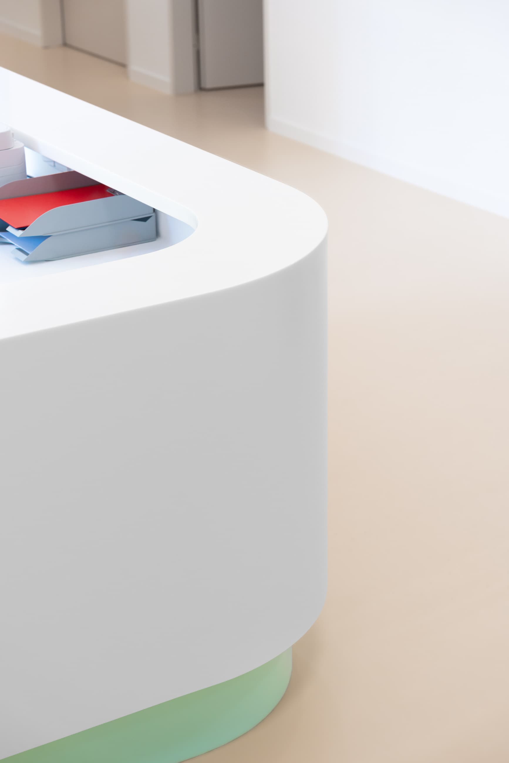 Recepce: Kombinace materiálu Corian a kompaktní desky vytváří elegantní a hygienicky nenáročné řešení s důrazem na dlouhou životnost a estetiku.