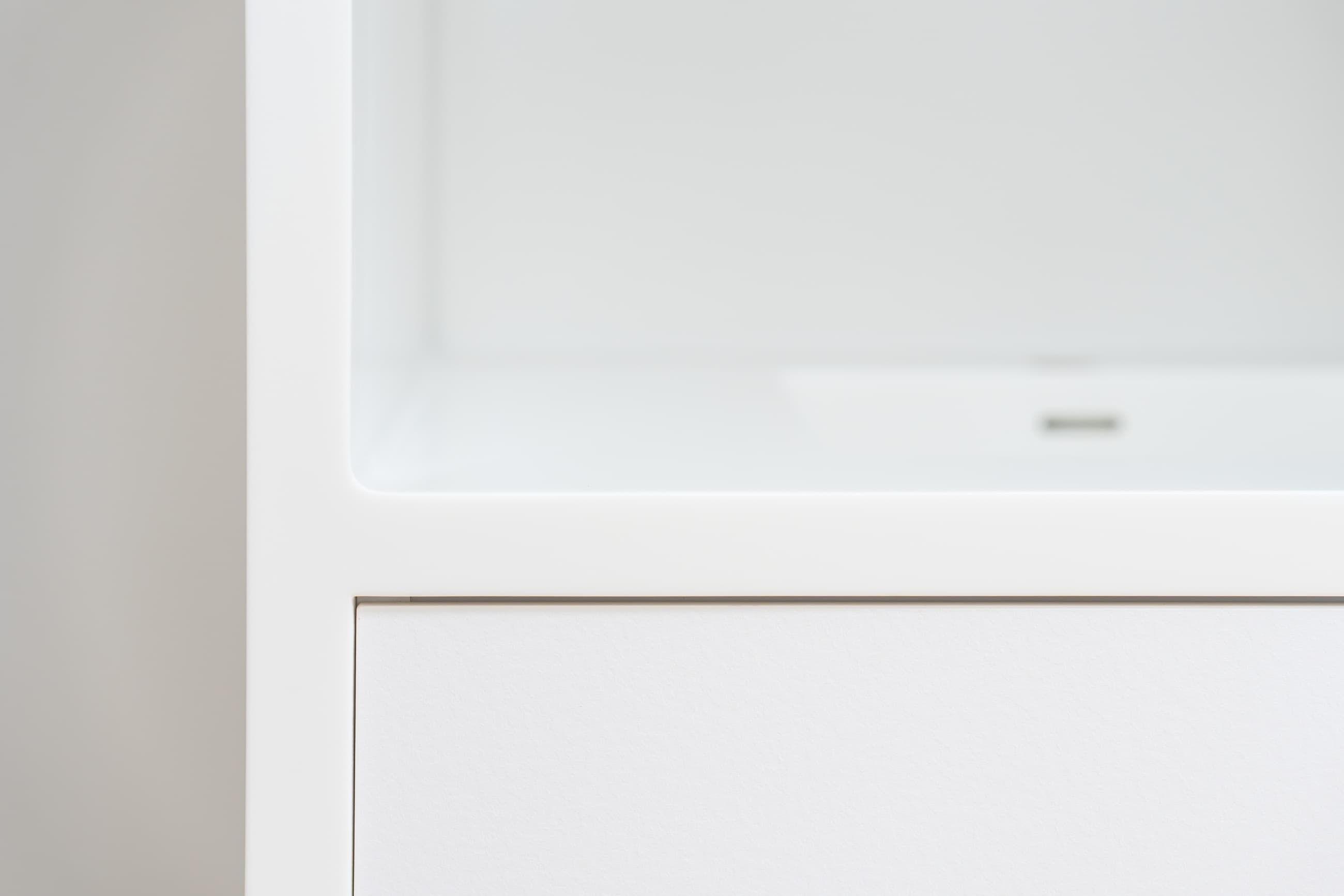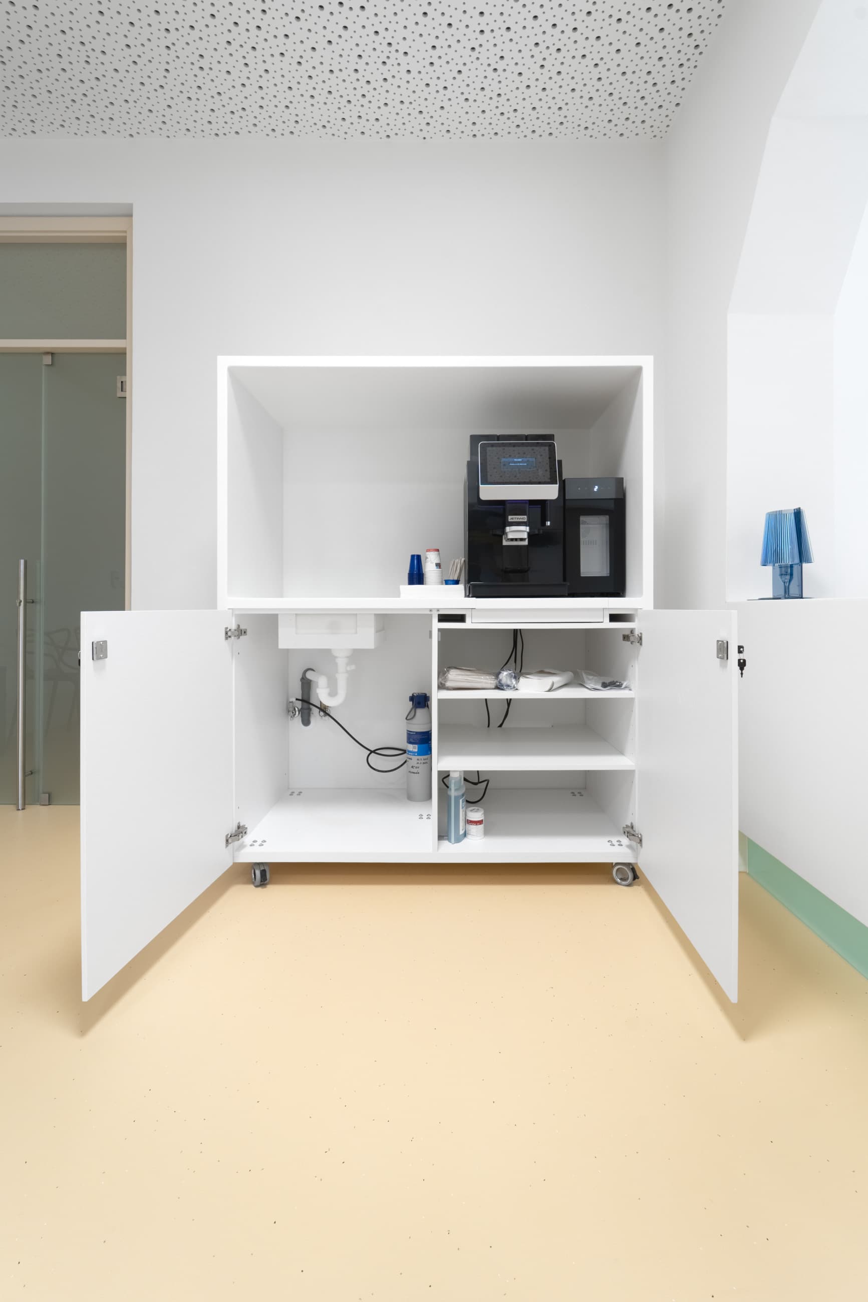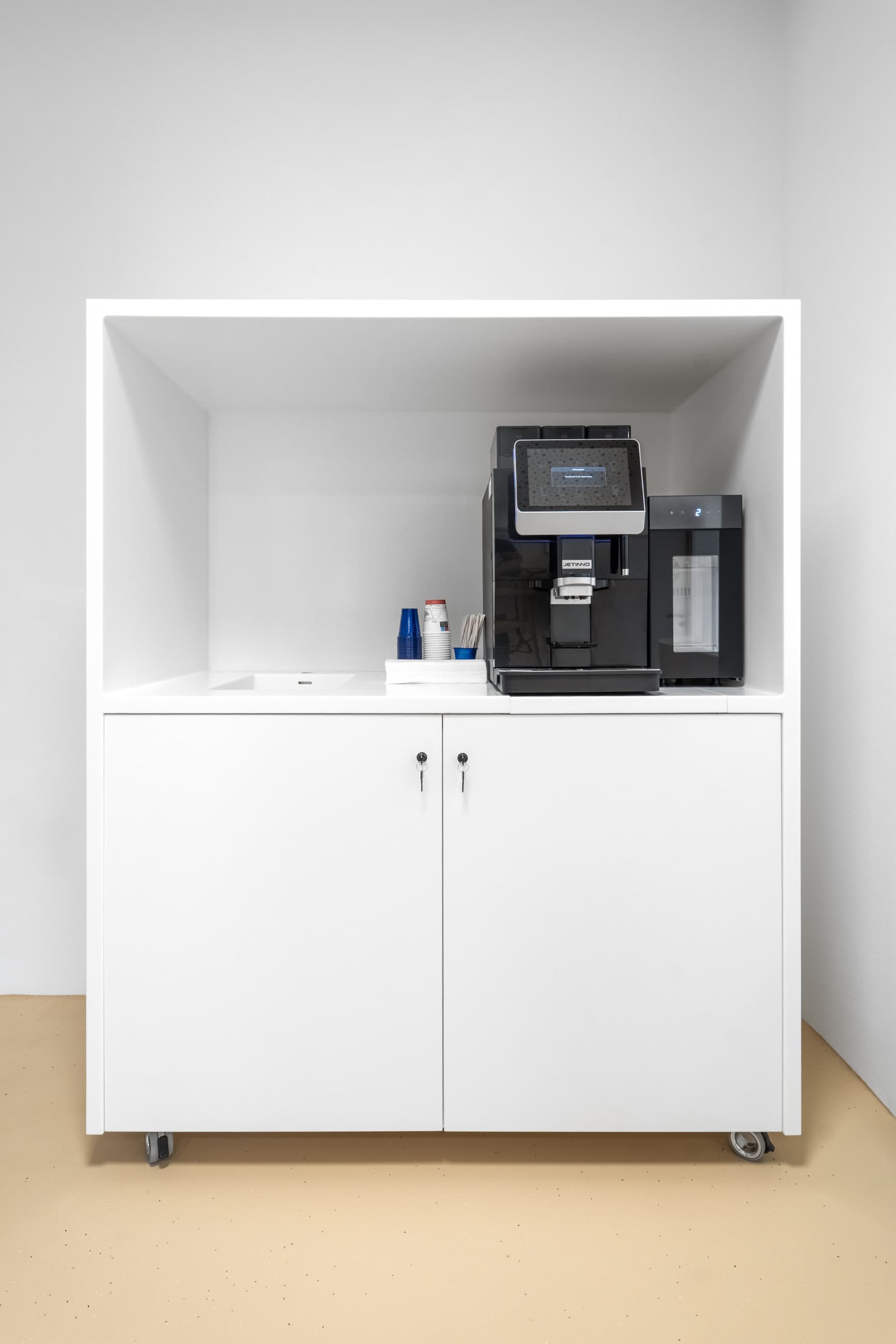 Kiosek na kávovar: Celý korpus je zhotoven z Corianu, doplněný dvířky z kompaktní desky – funkční a vizuálně čisté řešení, které nenarušuje celkový minimalistický výraz prostoru