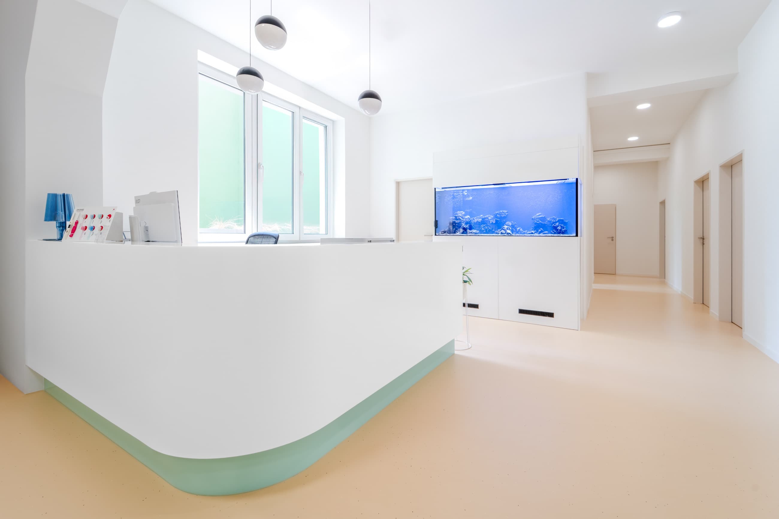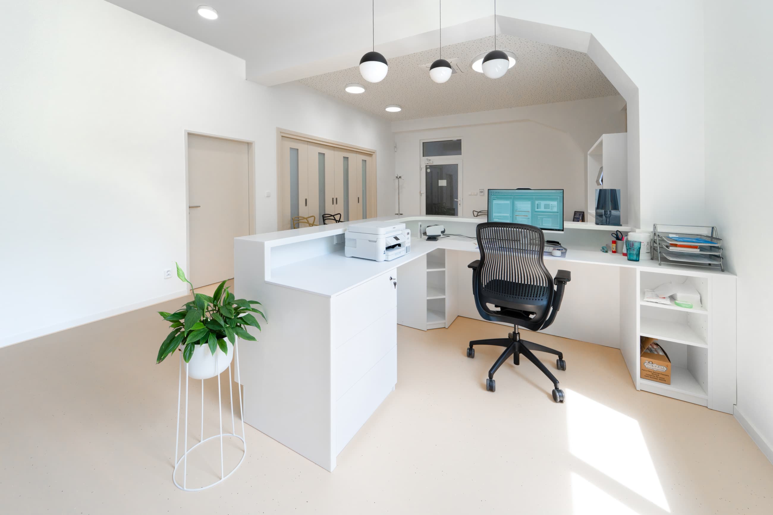 Interiér zubní ordinace se nese v duchu minimalismu a čistých linií, které podporují klidnou a profesionální atmosféru prostoru: