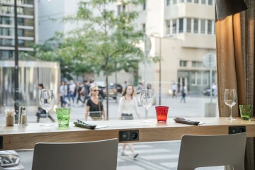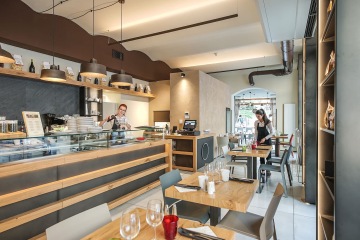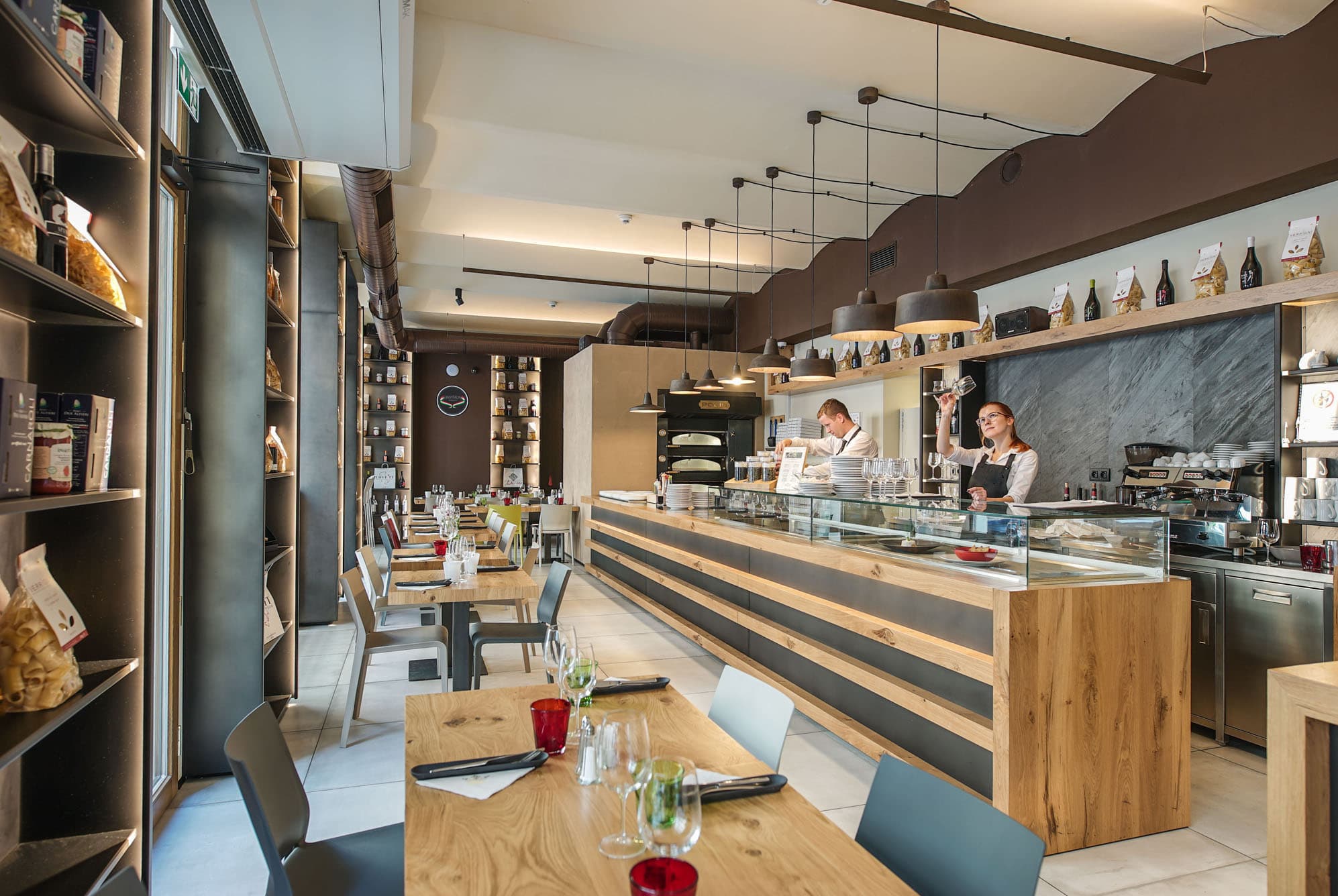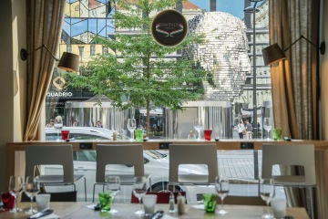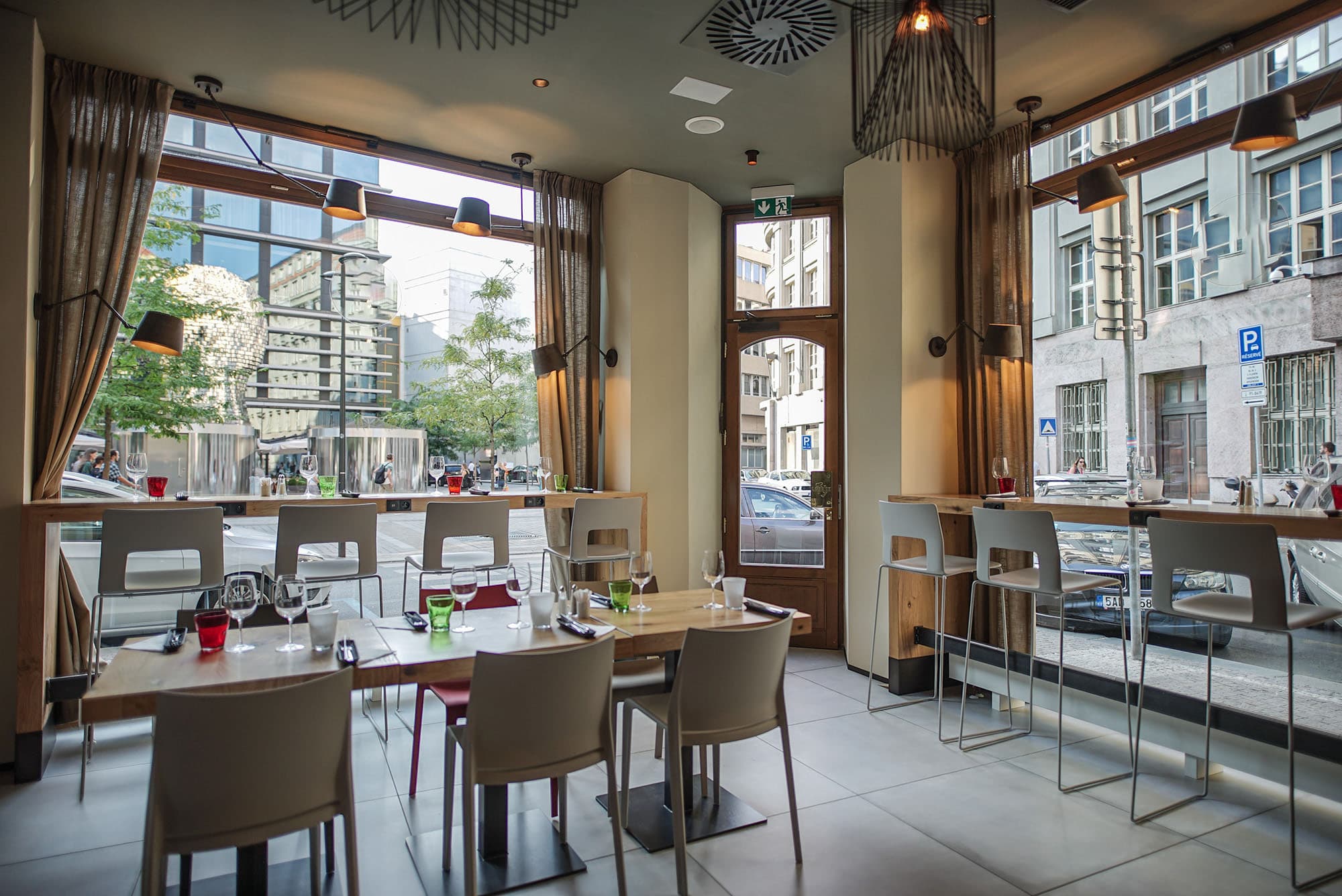 Design interiéru restaurace kombinuje přírodní prvky s industriálním stylem, což vytváří jedinečný a stylový prostor: